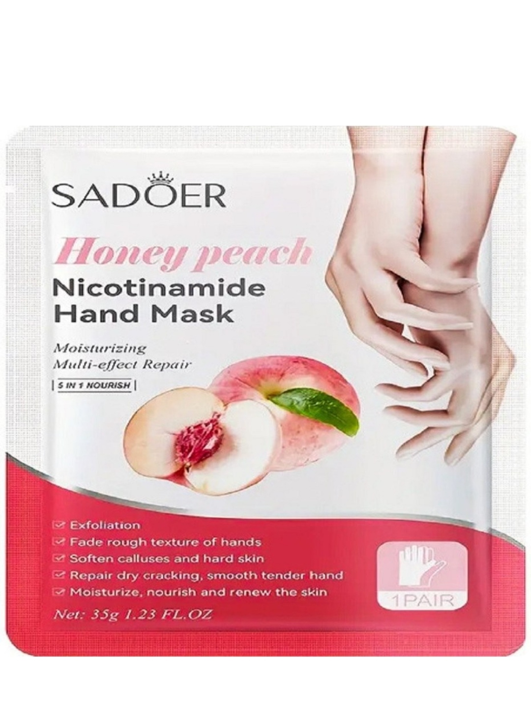 ماسک ورقه‌ای سادور SADOER مخصوص دست حاوی عصاره هلو عسلی (5 در 1) وزن 35گرم. چین