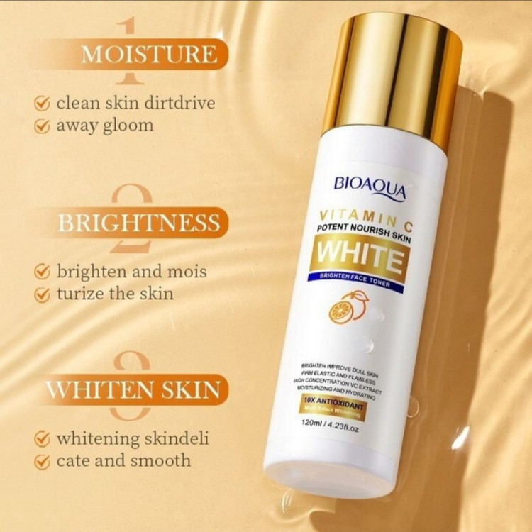 این تونر صورت بیوآکوا حاوی ترکیبات ویتامین C است و رطوبت پوست را جبران می کند و خشکی پوست را بهبود می بخشد. ویتامین C یک آنتی اکسیدان قوی است که رادیکال های آزاد را خنثی می کند و چین و چروک ها را صاف می کند. پوست را سفید می کند و با استفاده منظم 2 بار در روز، رنگدانه ها و کک و مک را از بین می برد. این محصول به آرامی به عمق پوست و منافذ آن نفوذ کرده و چربی و هرگونه مواد باقیمانده آرایش را تمیز می کند. ویتامین C یک گزینه مطمئن برای مراقبت پوستی است. با توجه به مزایای ضد پیری آن، این آنتی اکسیدان حیاتی به دلیل قدرت بازیابی عمیق و محافظت از پوست شناخته میشود. حال تاثیر این آنتی اکسیدان در این محصول 10 برابر بیشتر است! ویتامین سی می تواند تولید ملانین را مهار کند. لکه های تشکیل شده و رنگدانه ها را روشن کند و همچنین درخشندگی پوست را بهبود بخشد. تونر سفید کننده ویتامین سی با نفوذ با لایه های پایین پوست سلول های آسیب دیده را فعال میکند. باعث تقویت متابولیسم پوست می شود که در نهایت سلامت و سر زندگی را به پوست شما بر میگرداند تا پوستی مستحکم و کشسان داشته باشید