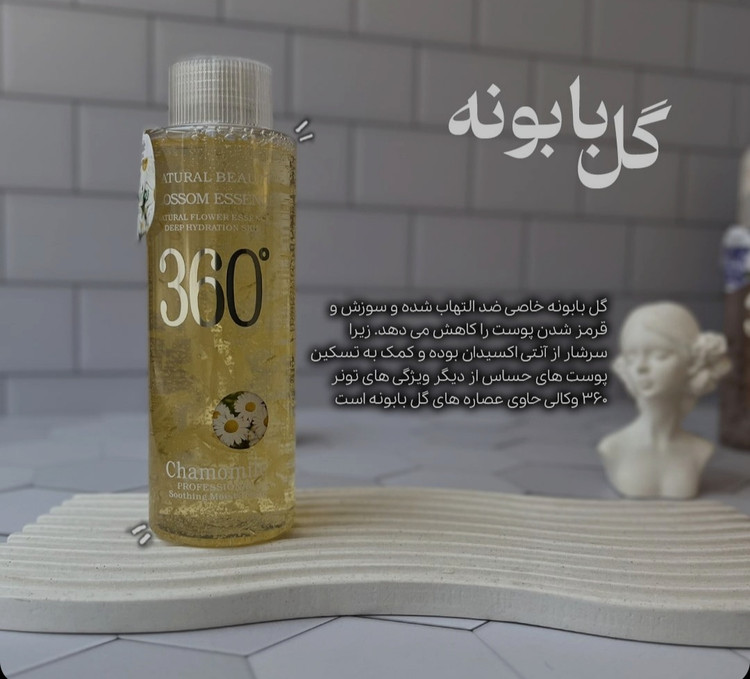 - مبارزه با علایم پیری یکی دیگر از خواص تونر 360 حاوی عصاره گل بابونه است که با افزایش کلاژن سازی در پوست به بهبود خاصیت ارتجاعی و صافی و زیبایی صورت کمک شایانی می نماید.